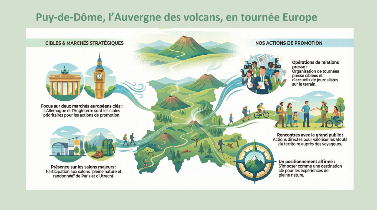 Le Plan d’Actions Touristiques du Puy-de-Dôme traduit notre ambition de renforcer l’attractivité du territoire et d’accompagner les acteurs locaux dans leur développement. À travers des orientations claires et des actions concrètes, la direction du Développement du Tourisme et des Loisirs mobilise ses expertises pour valoriser les richesses naturelles, culturelles et économiques du département, tout en répondant aux attentes des visiteurs d’aujourd’hui et de demain.